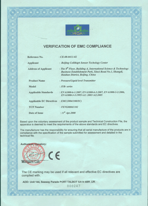 北京昆侖海岸傳感技術中心壓力、液位系列產品經歐盟CE認證機構檢測,通過了安全、環保、衛生等各項指標測定,于2008年4月11日獲得歐盟認證機構頒發的CE認證證書,取得了進入歐洲聯盟市場的銷售通行證。這標志著北京昆侖海岸傳感技術中心壓力、液位系列產品達到歐盟指令性要求,實現了與歐洲和國際標準的全面接軌。